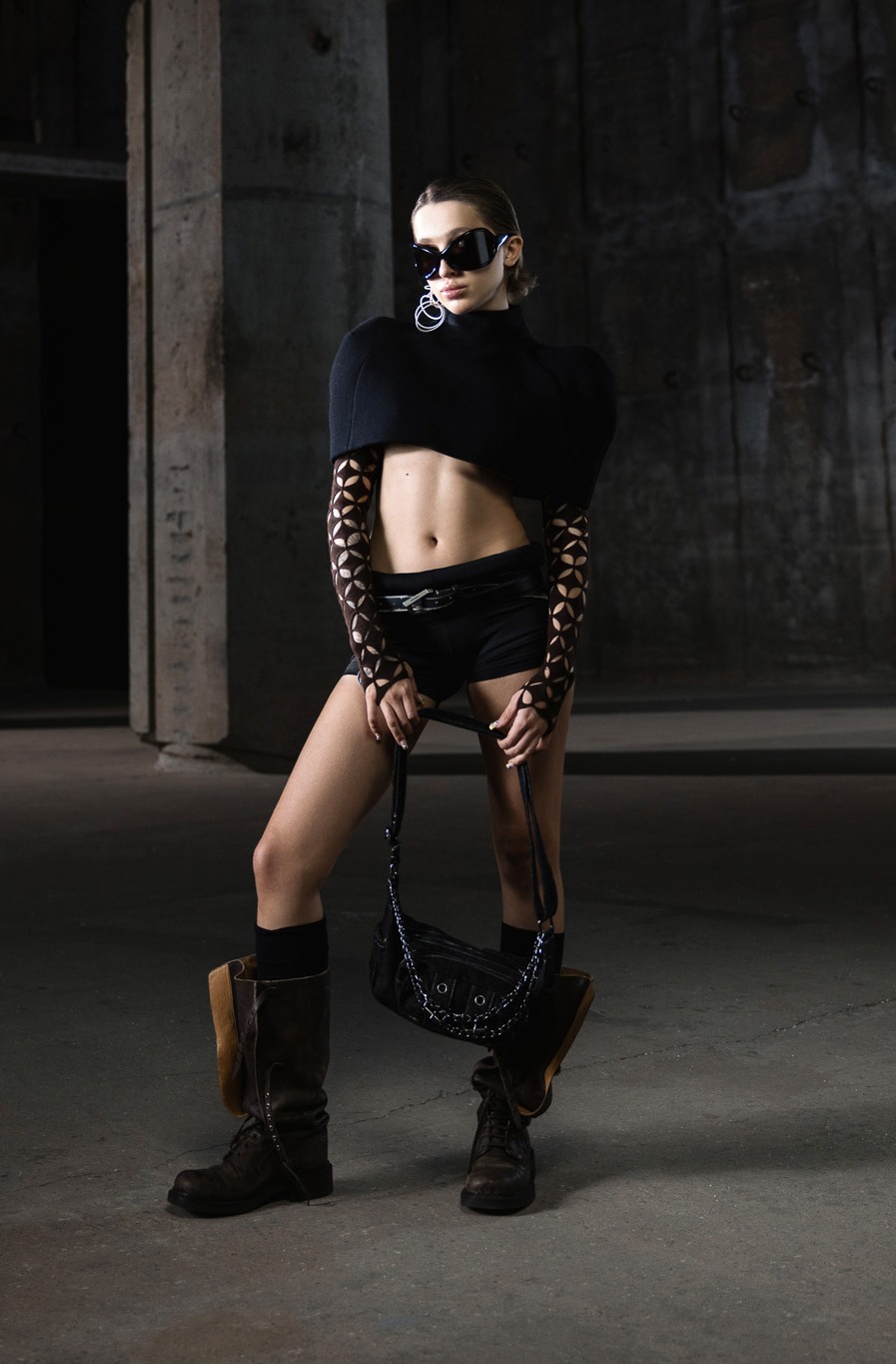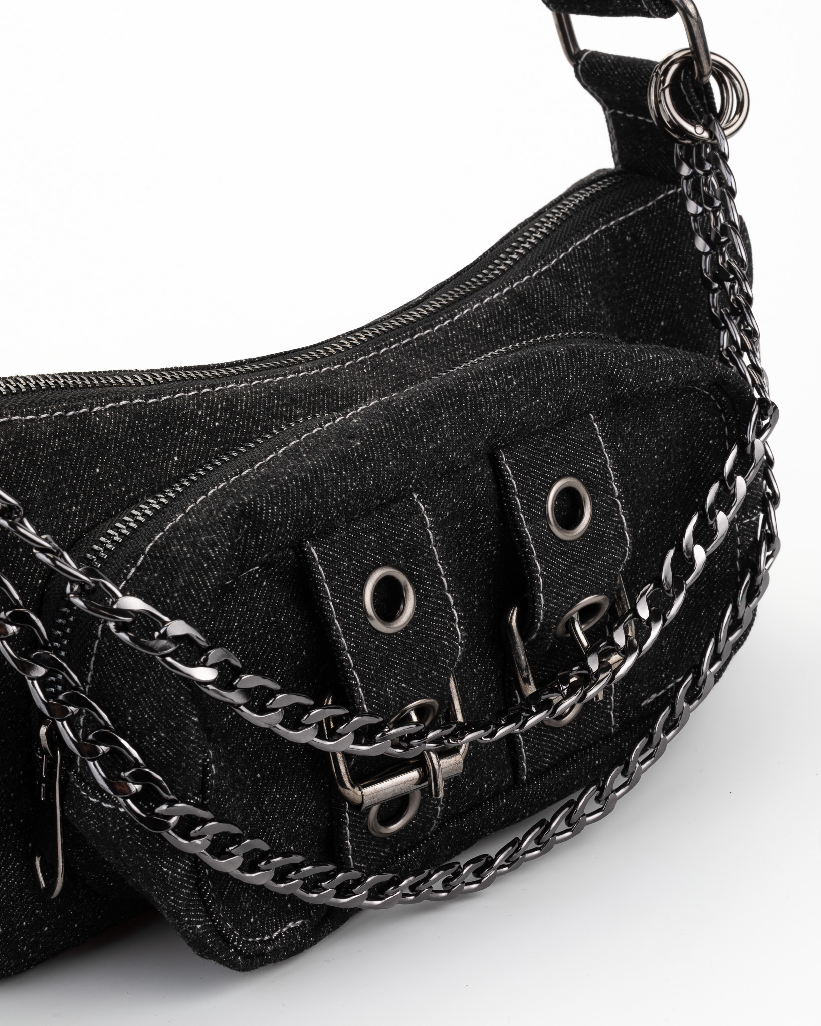 Сумка малой формы, созданная из плотного чёрного денима с выраженной текстурой и контрастной строчкой. Силуэт вдохновлён утилитарными аксессуарами начала 2000-х: компактная форма, функциональные карманы спереди и усилённые детали креплений.