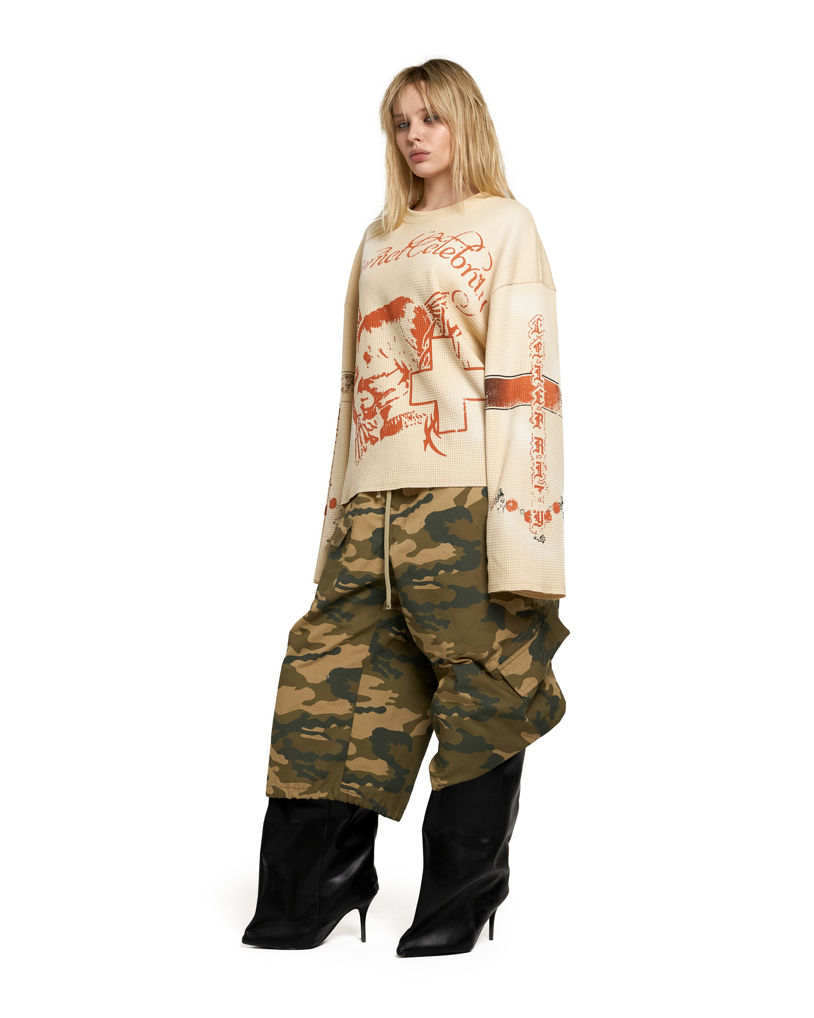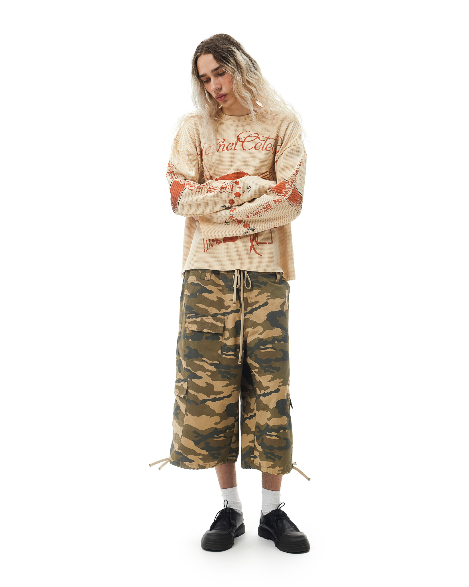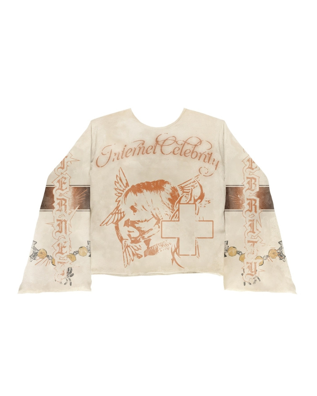 Лонгслив выполнен из мягкой фактурной 100% хлопковой ткани с вафельной структурой, что создаёт эффект приятного на ощупь и лёгкого объёма. Базовый цвет — тёплый бежевый. На изделии нанесён крупный графический принт в винтажной стилистике: в центре изображена Gensyxa с крыльями, выполненный в выцветшем терракотовом тоне, так же использутся техника нанесения спрея для более интересного эффекта винтажности. Надпись “Internet Celebrity” проходит по груди, добавляя ироничный и актуальный контекст.