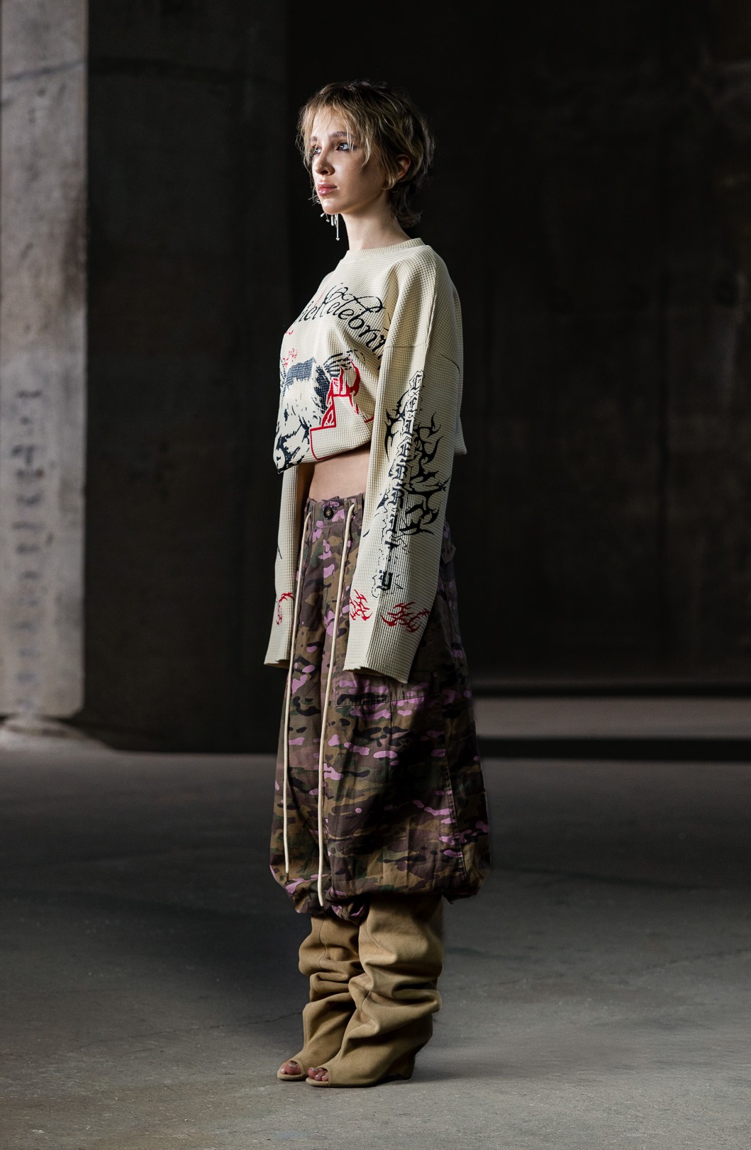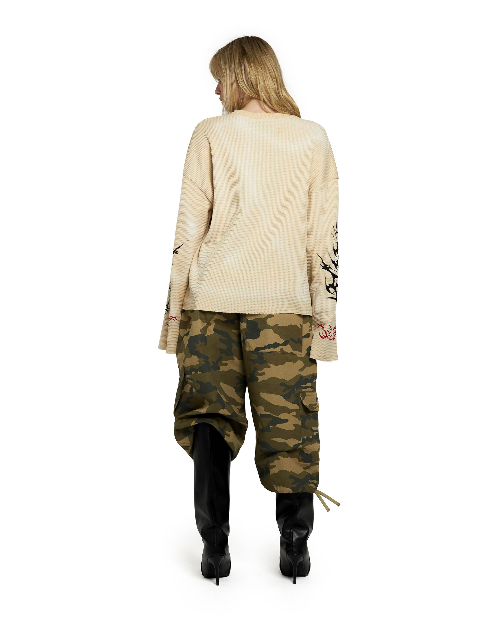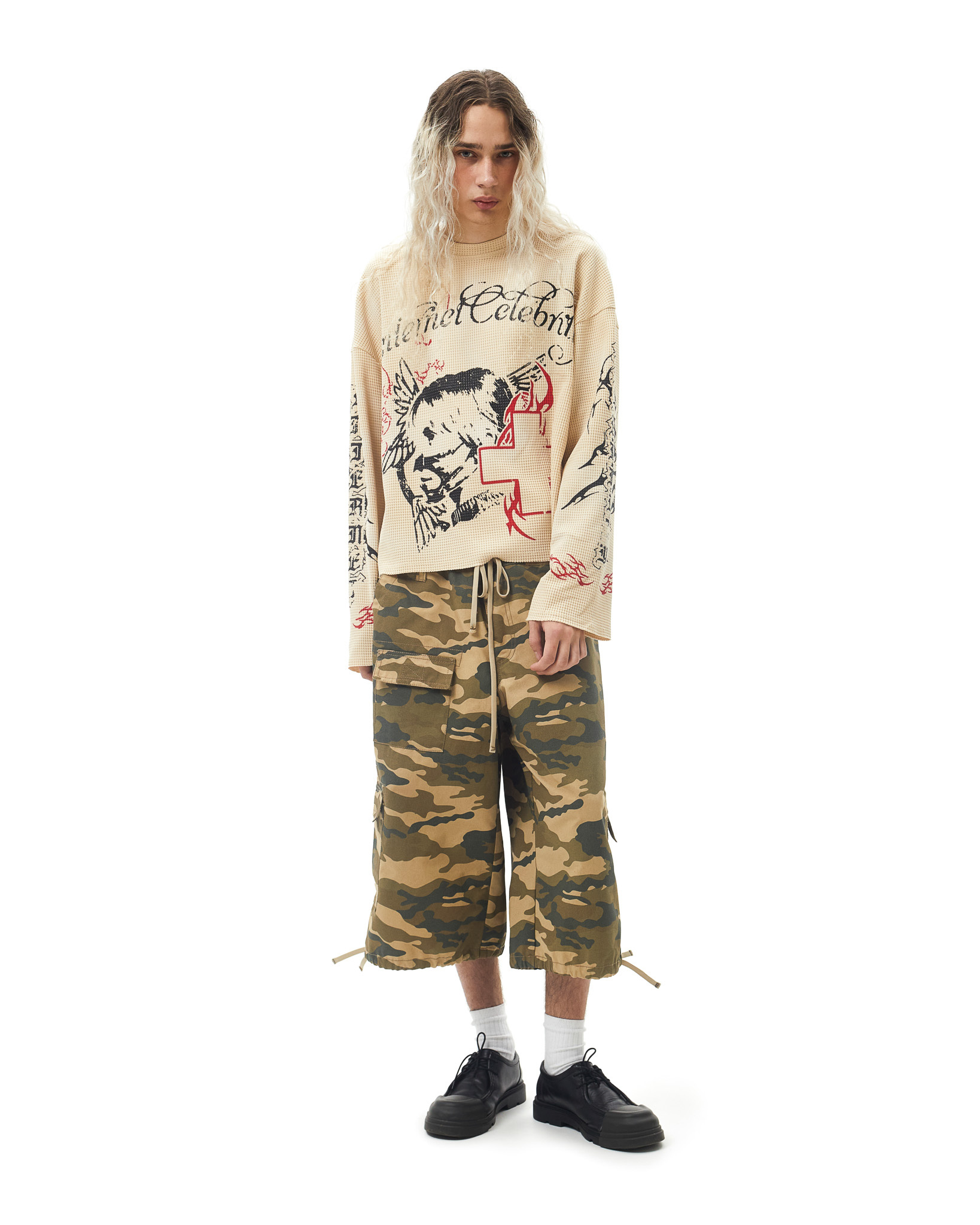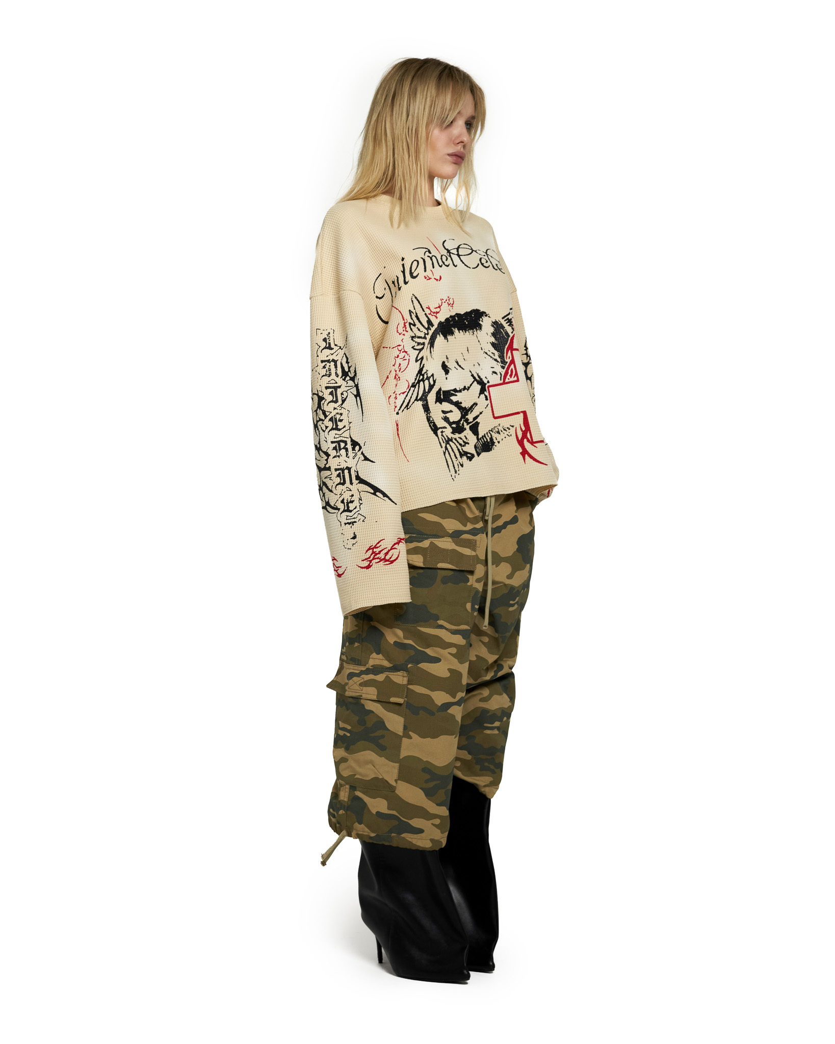 Лонгслив выполнен из мягкой фактурной 100% хлопковой ткани с вафельной структурой, что создаёт эффект приятного на ощупь и лёгкого объёма. Базовый цвет — тёплый бежевый. На изделии нанесён крупный графический принт в винтажной стилистике: в центре изображена Gensyxa с крыльями, выполненный в выцветшем терракотовом тоне, так же использутся техника нанесения спрея для более интересного эффекта винтажности. Надпись “Internet Celebrity” проходит по груди, добавляя ироничный и актуальный контекст.