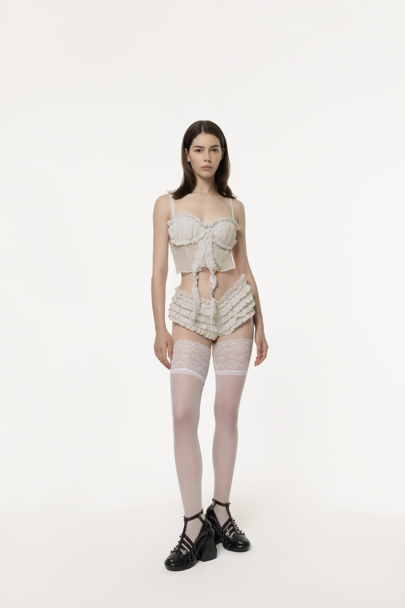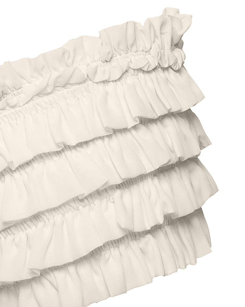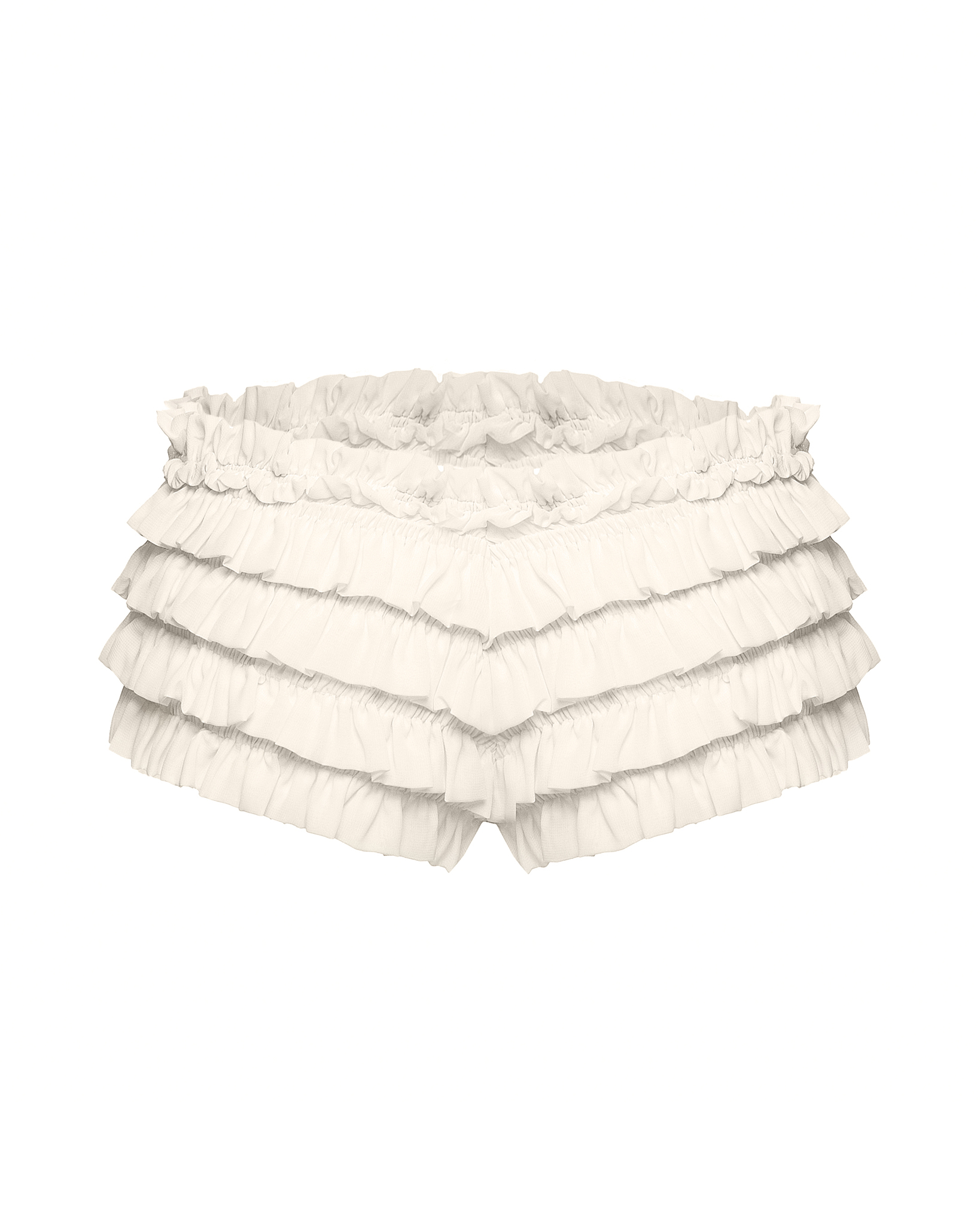 Шортики De Théatre, имеют низкую посадку и декорированы горизонтальными резинками и рюшами из шифона, придающими им изысканный вид. Легкий, воздушный шифон приятно ложится на теле, не сковывает движений. Подкладка из штапеля придает дополнительную нотку шелковистости и делает шорты максимально удобными для ношения.
